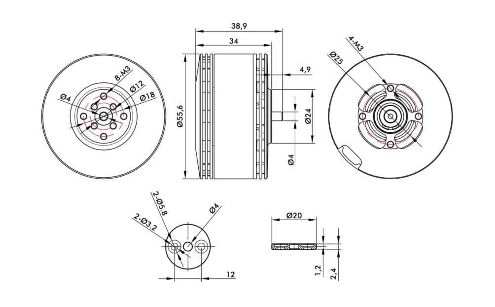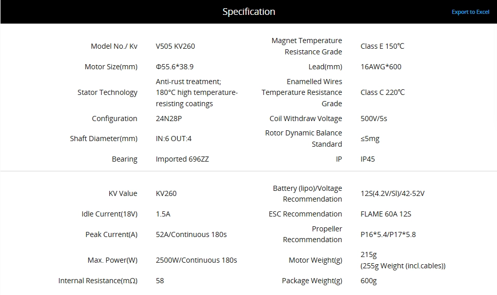 | Masa silnika (g) | 215 g (waga 255 g (z kablami) |
