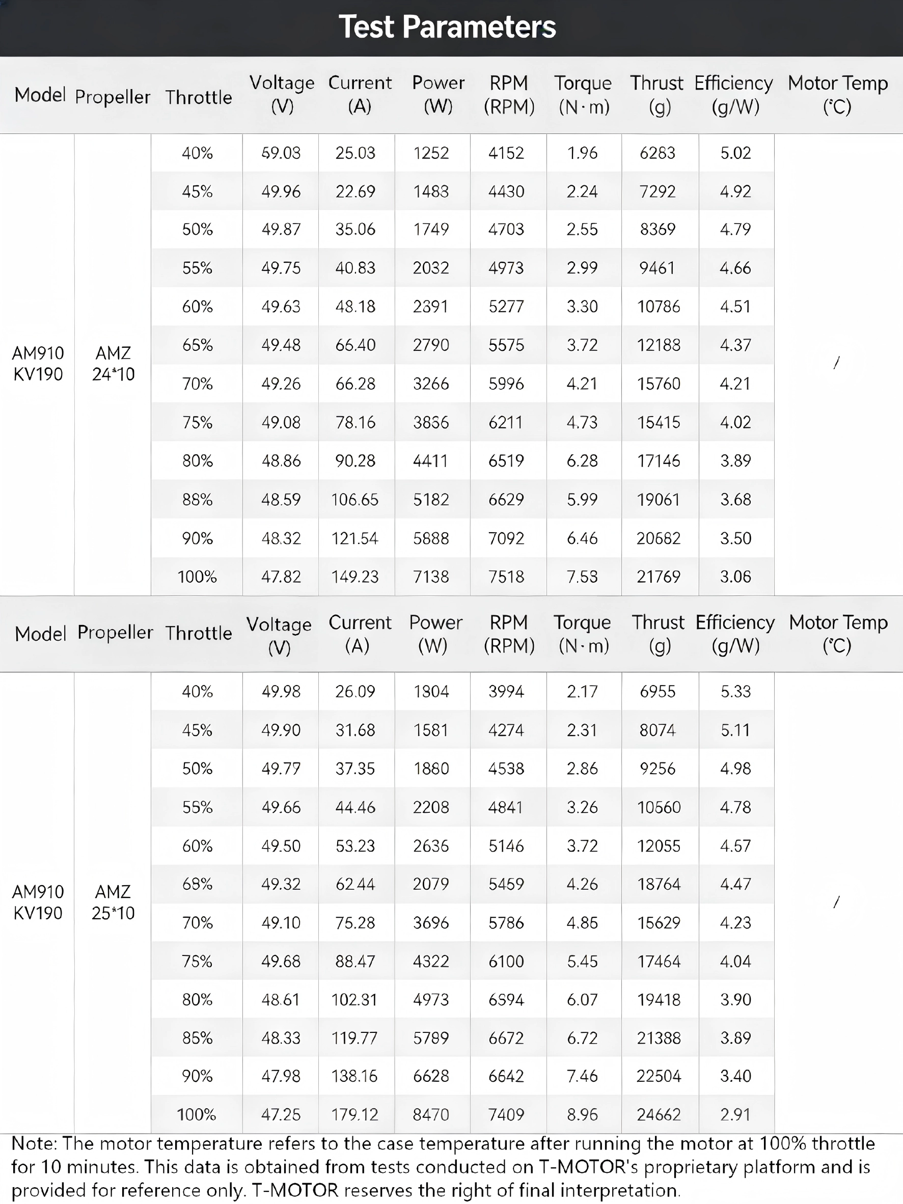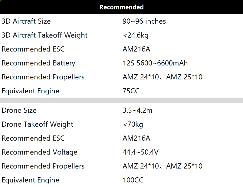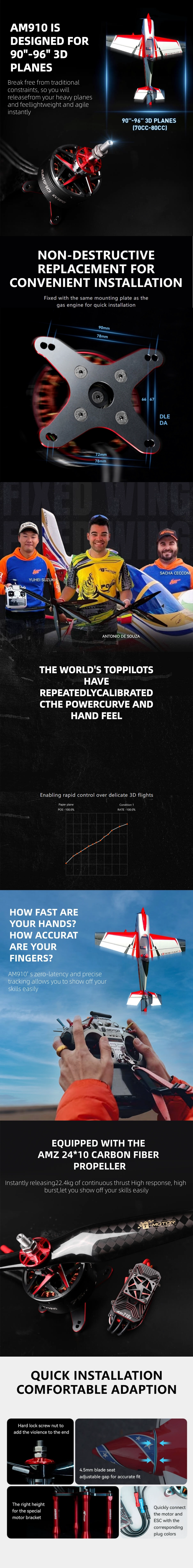 The T-Motor AM910 is a professional brushless 3D aerobatic motor built for 90‑96 inch 3D fixed‑wing aircraft. As a reliable professional drone motor, it provides stable power output and precise control. Designed as a high torque low RPM motor, it delivers up to 22.4kg pulling force with zero-latency response. Paired with AMZ24*10 carbon fiber propellers, it ensures strong burst performance. The quick-change installation and HARD LOCK nuts offer agile flight control for smooth 3D aerobatic maneuvers.