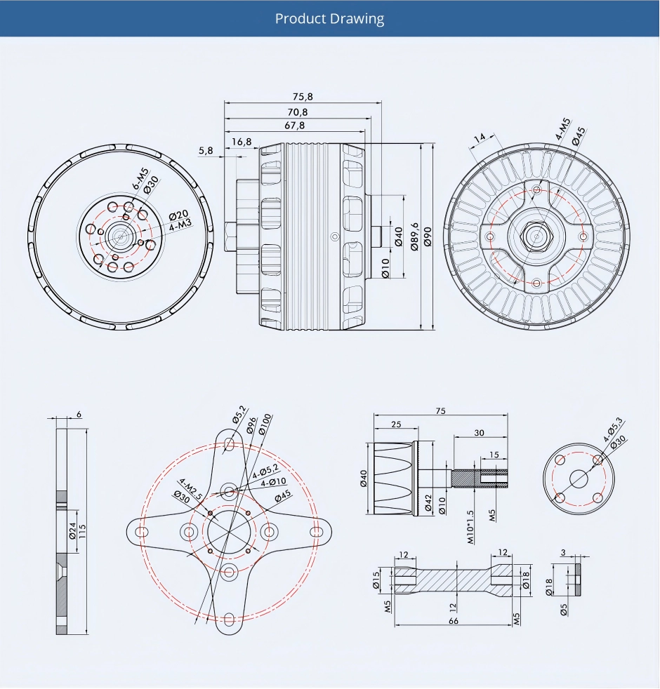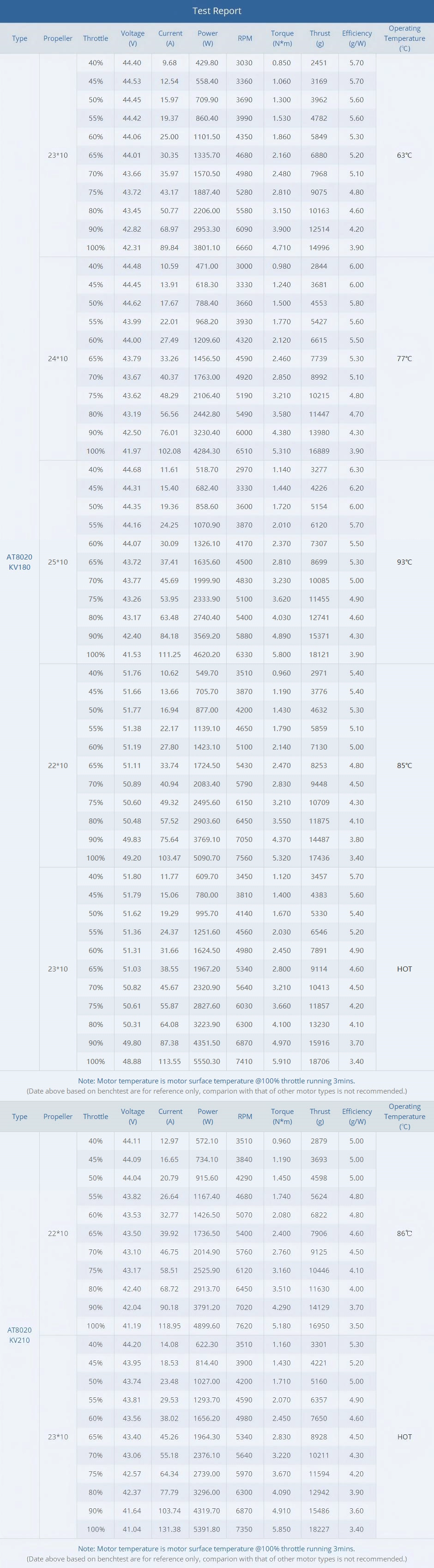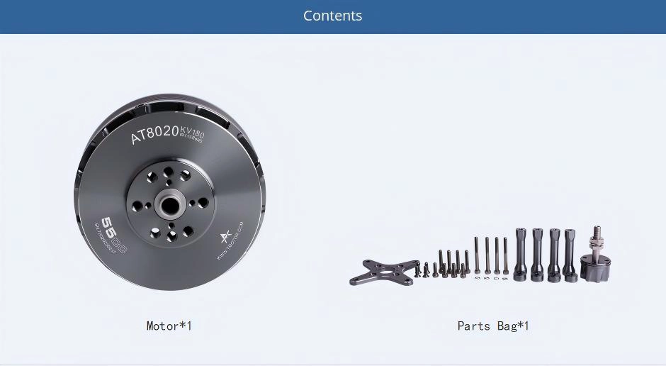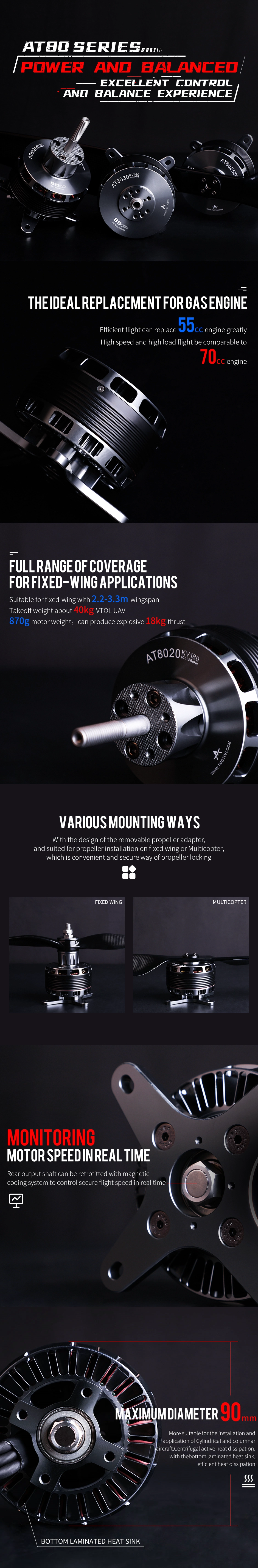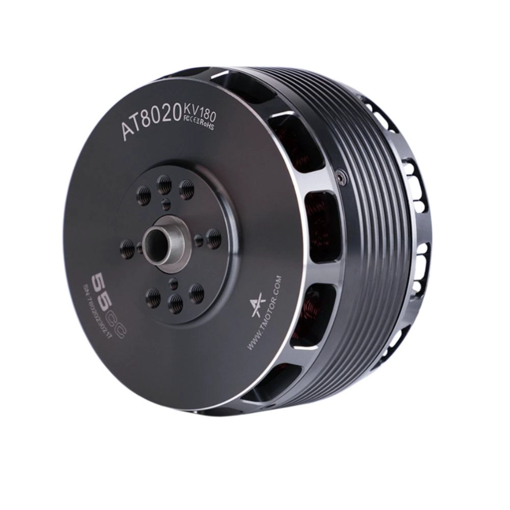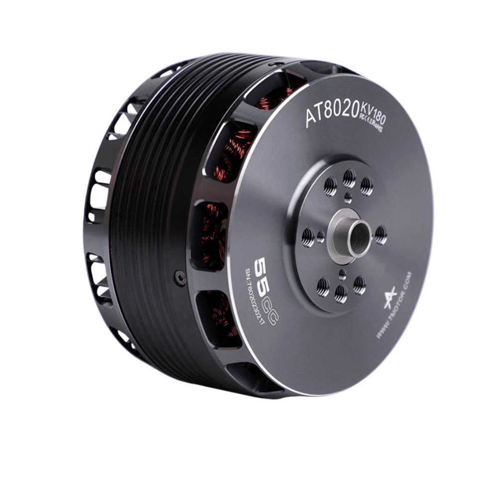 The T-Motor AT8020 is a high-end brushless DC motor for fixed-wing and VTOL UAVs, serving as an ideal Fixed wing UAV power motor and Large UAV brushless motor. With 18kg thrust and 5500W power, it delivers excellent performance as a High power density motor. It features efficient heat dissipation, versatile mounting and 10–12S battery compatibility for professional drone applications.