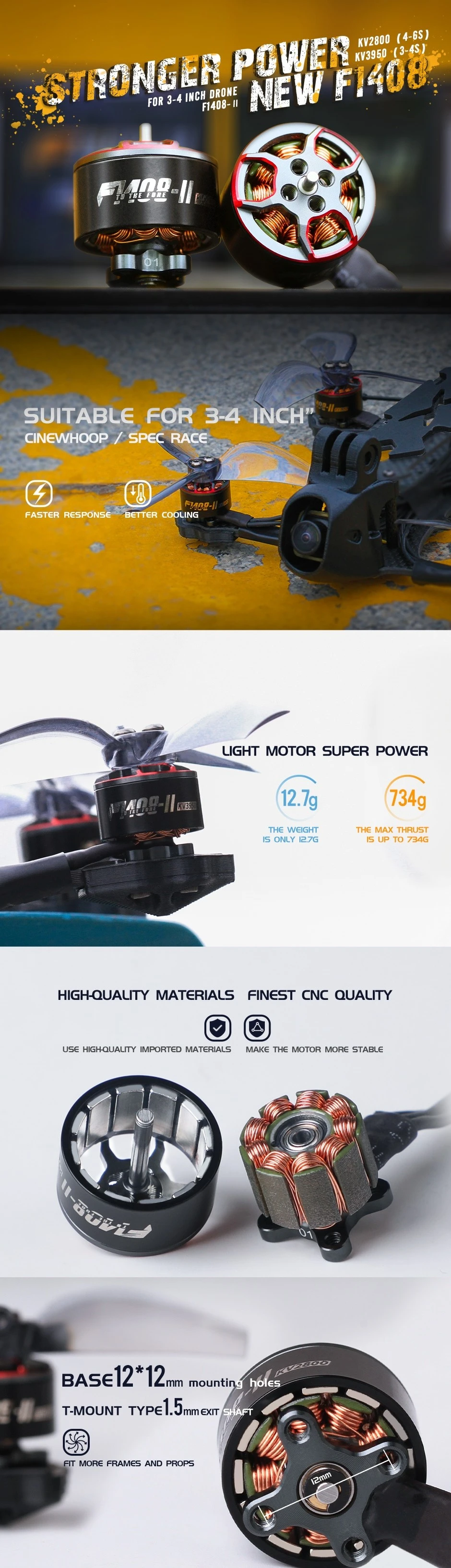Equipped with 12×12mm standardized mounting holes, secure T-MOUNT prop lock and 1.5mm versatile shaft, this Universal Frame Drone Motor fits various propellers/frames. Tailored for 2.5–4 inch (especially 3 inch) FPV builds, it supports batch assembly, making it a cost-effective choice for wholesalers and distributors.
