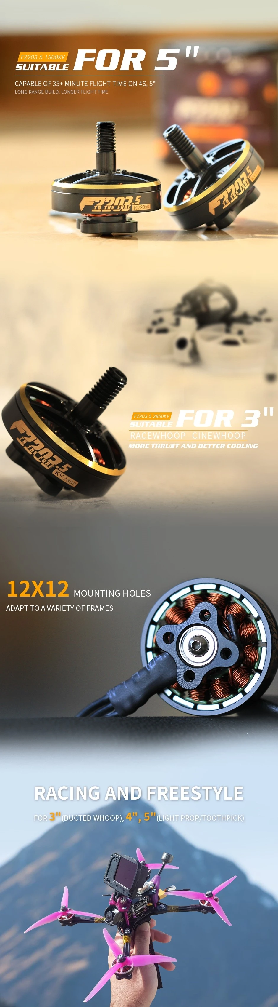 It caters to diverse drone builds with targeted KV options: the 1500KV variant is engineered as a Long-Range FPV Motor perfect for 5" long-range setups, acting as an Extended Flight Time FPV Motor with extended power support for longer flight time; the 2850KV version suits 3" Cinewhoop and Racewhoop builds, ensuring agile responsiveness for high-intensity maneuvers.