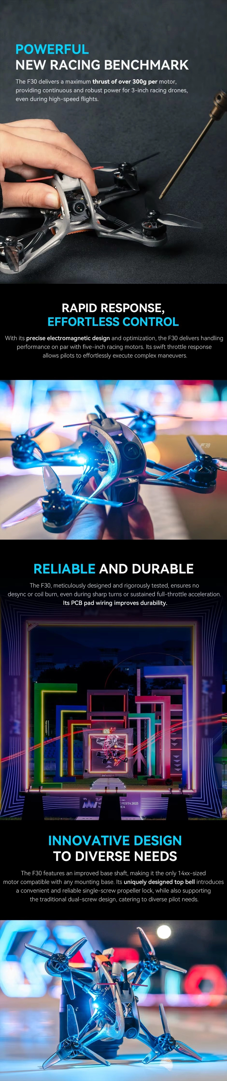 Built to endure the toughest flights, the rigorously tested F30 resists desync and coil damage (even during sharp turns or full-throttle sprints), while reinforced PCB pad wiring boosts long-term reliability.