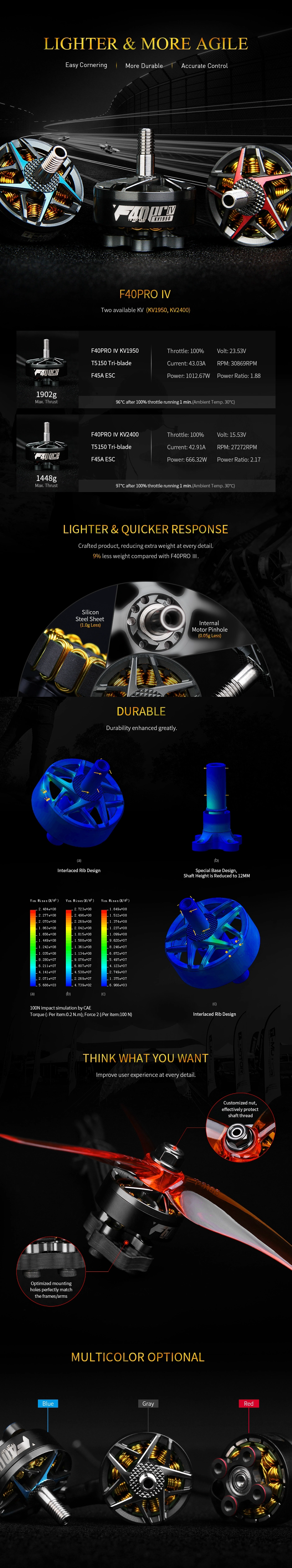 The F40 PRO-IV 2306.5 continues the lineage of great FPV brushless motors by T-MOTORHOBBY. The F40 PRO-IV is lighter and agile compared to its predecessor, 9% less weight compared to the F40 PRO III. We have worked very hard to improve the user experience by crafting and enhancing every detail of the F40 PRO IV to help reduce its weight. Things that were considered were the internal motor pinhole, 12mm titanium shaft, silicon steel sheet and customized silicone wire. The 2306 size suitable for 5 inch freestyle and racing