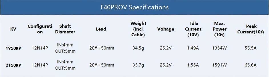 The F40PROV offers two KV variants: 1950KV for advanced training, 2150KV for extreme racing—letting pilots pick the perfect power profile. As a China Top-Tier F40PROV Racing Drone Motor Manufacturer, we engineer every unit for precision and reliability.