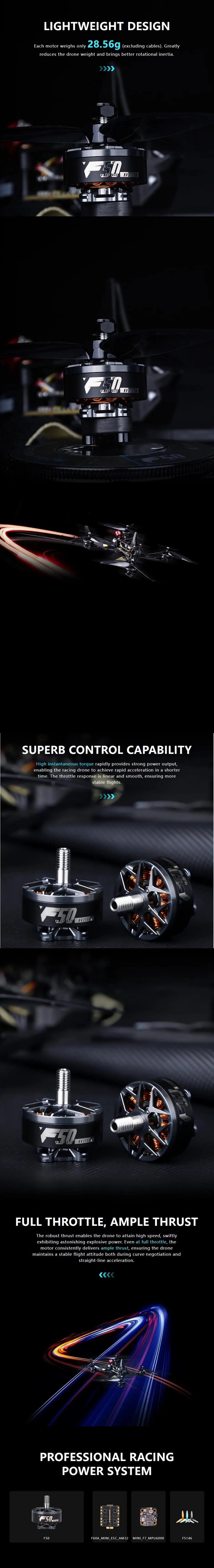 Built as a reliable Drone Racing Component, it packs high instantaneous torque for enhanced maneuverability—delivering explosive power for rapid acceleration and smooth throttle response for stable flight. It also ensures effortless full-throttle acceleration, with robust thrust that hits top speeds quickly and maintains steady flight through curves and sprints.
