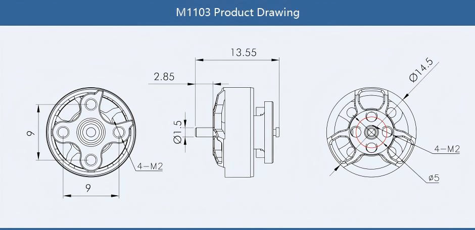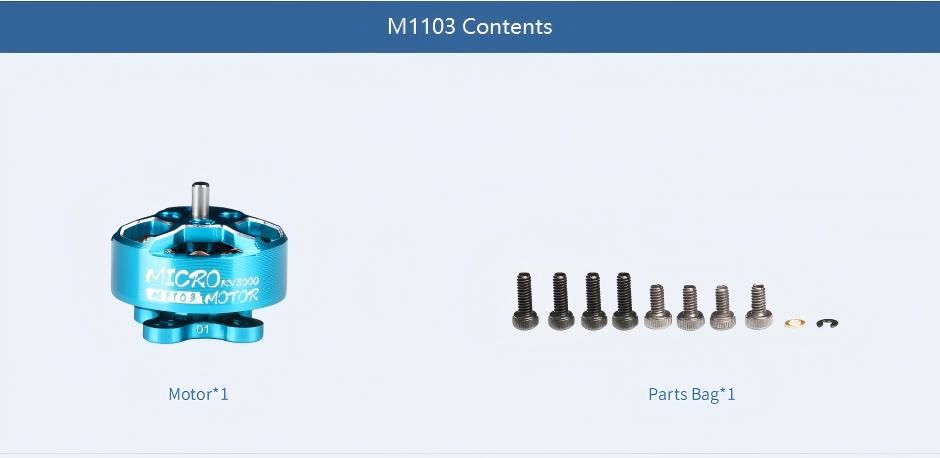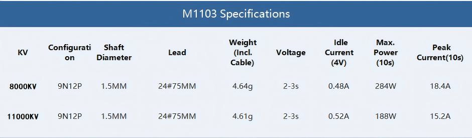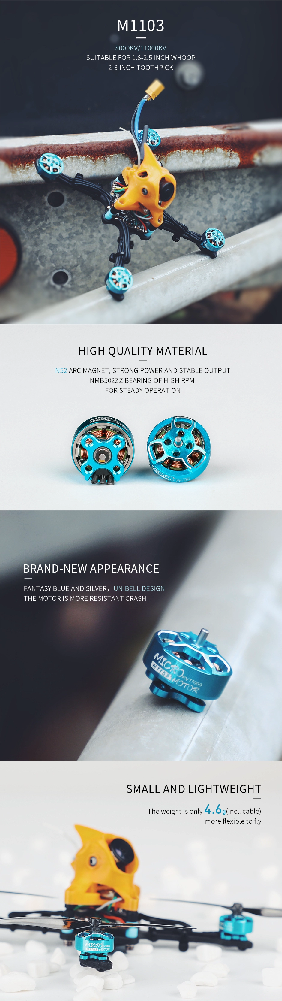 M1103, a high-performance Micro Motor for micro FPV drones, fits 1.6-2.5" WHOOP & 2-3" Toothpick, ideal as Indoor Flying FPV Drone Motor. 8000KV/11000KV dual specs for diverse scenarios. As High Power FPV Motor, it has N52 magnets (strong power) and NMB502ZZ bearings (stable operation). Upgraded dreamy blue + aluminum rotor (crash-resistant). 4.6g (w/ wire), ultra-light for flexible flight, delivering premium power & control experience.