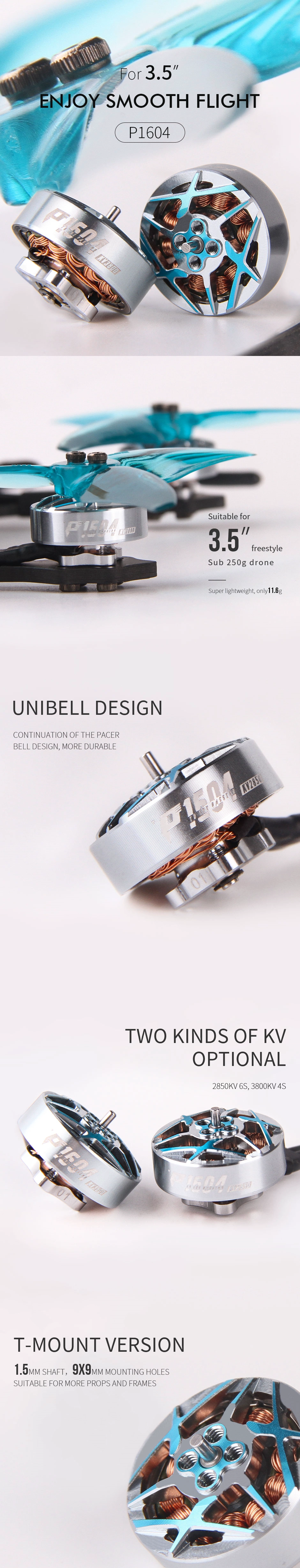 P1604 Brushless Freestyle FPV Drone Motor is premium Flower Flying Drone Parts and Multirotor Upgrade Motor, specifically designed for 3.5-inch flower flying. As a reliable FPV Propulsion Motor, it focuses on "smooth flight experience" (ENJOY SMOOTH FLIGHT) for pilots to enjoy effortless, stable flight. Boasting an ultra-light 11.6g design, it precisely fits 3.5-inch setups, reducing fuselage load for agile flight. Inheriting P-series aluminum cladding, it enhances rotor protection and anti-crash performance to handle in-flight impacts. Two power options (2850KV/6S & 3800KV/4S) meet diverse needs for thrust or endurance. With T-MOUNT propeller locking, 1.5mm output shaft and 9X9mm mounting holes, it enables quick propeller/frame assembly, fits various accessories, saves debugging time, and lets pilots fully enjoy flight control.![]()