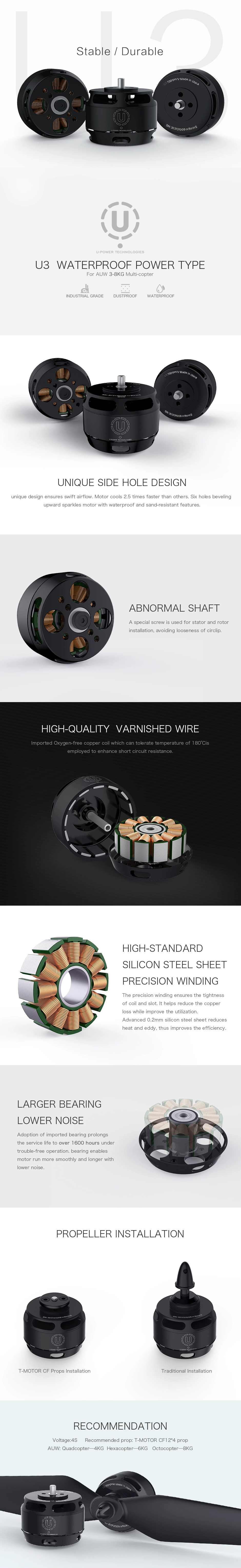 This kind of UAVs are usually for professional aerial photography, filming, delivery service and agriculture applications.Handmade high-temperature enameled wire has excellent fire protection, industrial grade waterproofing, anti-aging and other properties, which greatly extends the service life of the motor. The precision winding ensures the tightness of coil and slot.It helps reduce the copperloss while improve the utilization. Adoption of imported high-quality bearing ,enables motor run more smoothly and longer with lower noise.U3 Power series 700kv - recommended 4s esc and 12 or 13 inch props Water and dust resistant, designed for maximum reliability and long life.