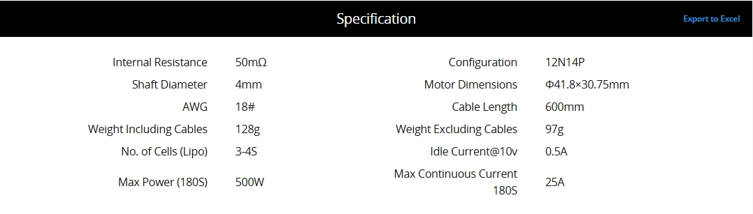 | No. of Cells (Lipo) | 3-4S | Idle Current | 0.5A |