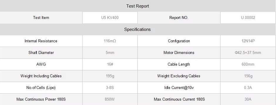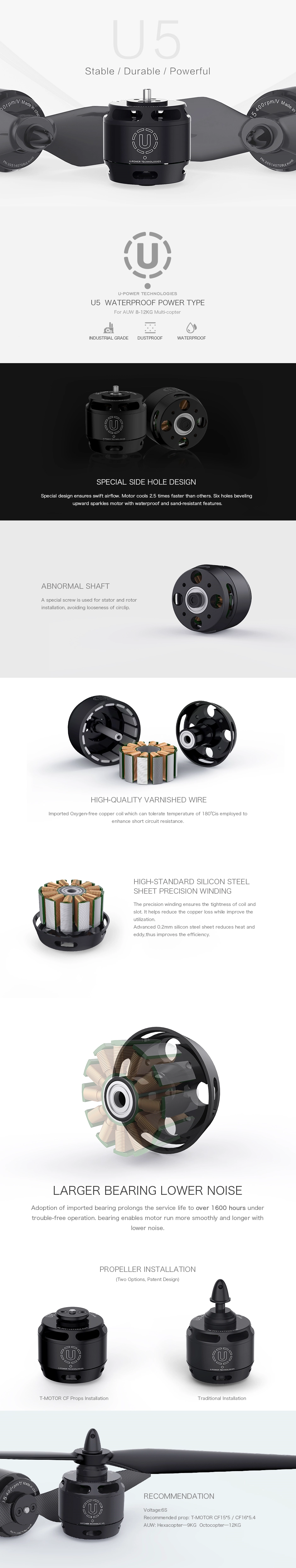 T-Motor U5 v2 Power series 400kv Brushless Motor - Recommended 6s and 14-16 inch props and Flame 60A ESC Water and dust resistant, designed for maximum reliability and long life. U-series motors are tested to military standards and offer smooth, quiet running with high efficiency.The U5 comes with a special design to ensure swift airflow. Motor cools 2.5 times faster than others. Six holes beveling upward sparkles motor with waterproof and sand-resistant features.Offers high-quality varnished wire. An imported Oxygen-free copper coil that can tolerate a temperature of 180 °C is employed to enhance short circuit resistance.
