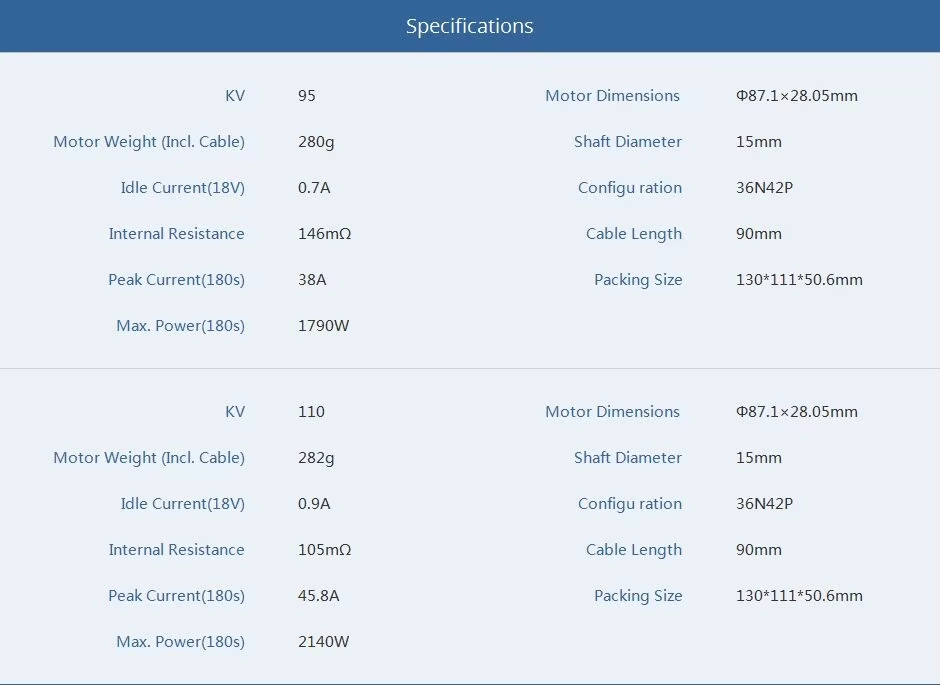 | Motor Dimensions | A87.1*28.05mm | Internal Resistance | 105mΩ |
