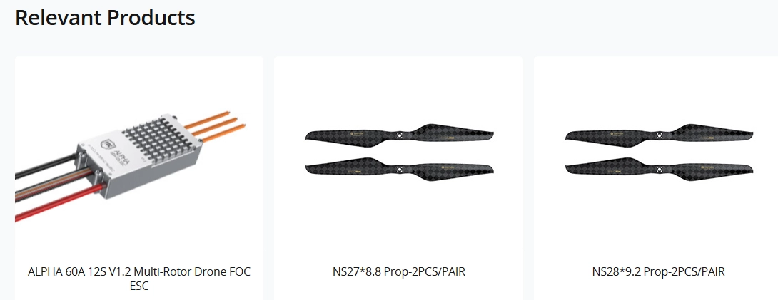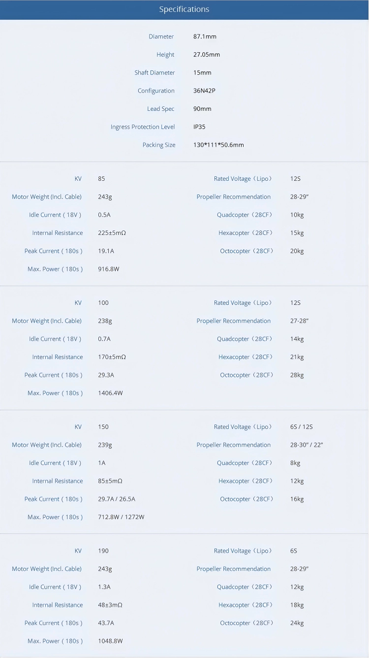 | Peak Current(180s) | 29.7A / 26.5A | Hexacopter(28CF) | 12kg |