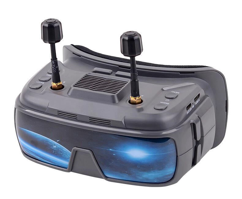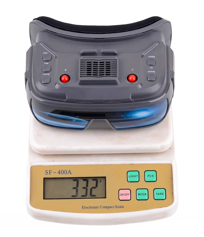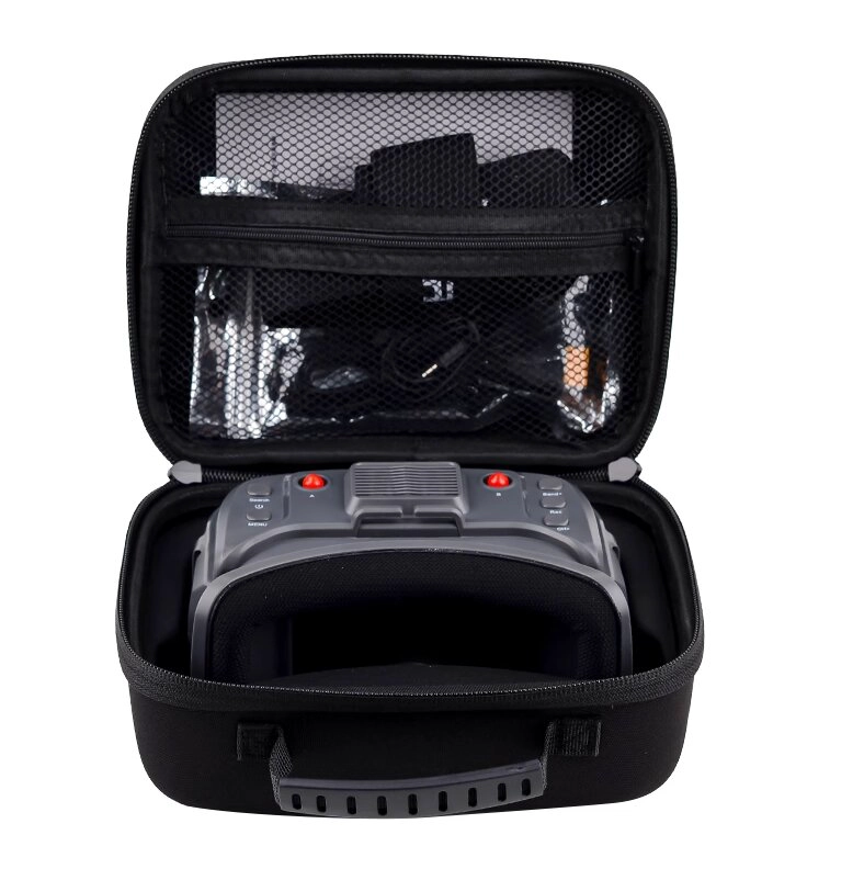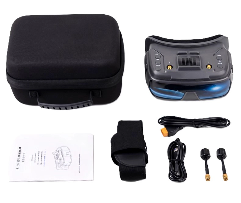 Our product features VR goggles with IPS High-Brightness Screen, delivering high-definition viewing. It has adjustable object distance (dual gears A/B) for 0-700 myopia users (no glasses needed), built-in DVR (max 32G), dual SMA antennas, multi-band switching, mini HDMI, TYPE-C wide-voltage charging, and a cooling fan for long-term stable VR goggles performance.