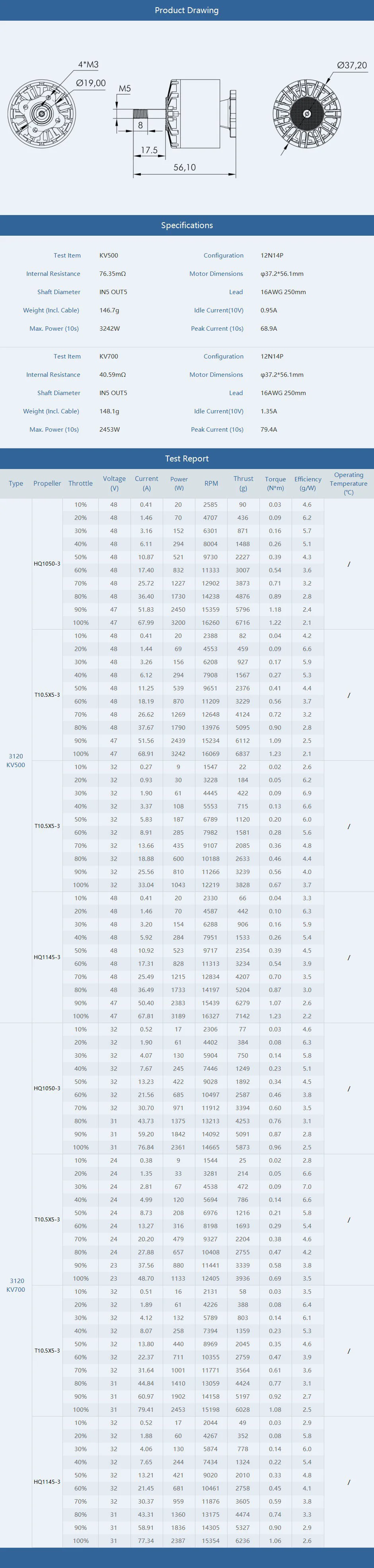 Specs at a glance: 6S–8S, 45–60 A ESC, KV 500/700, 7–9" props, mounts 16×16 & 19×19 mm, 5 mm prop shaft, 12N14P.